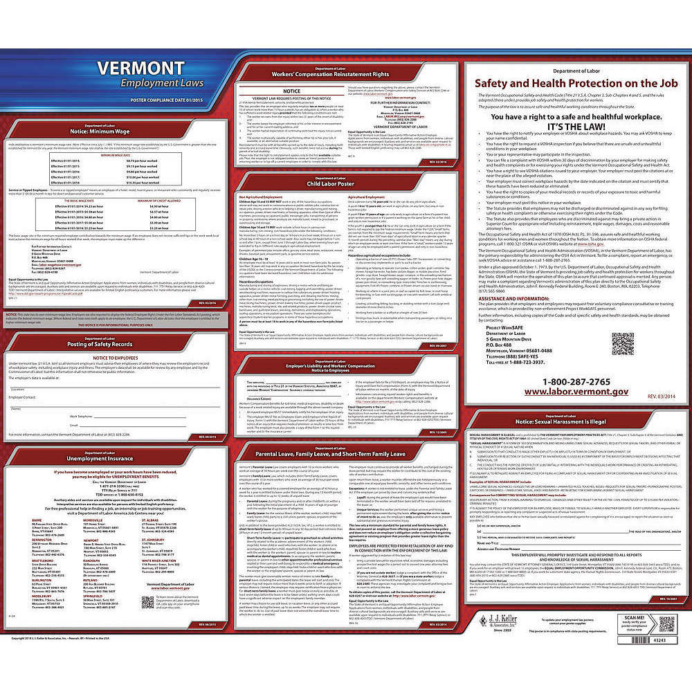 JJ KELLER 100-VT Labor Law Poster State Labor Law VT