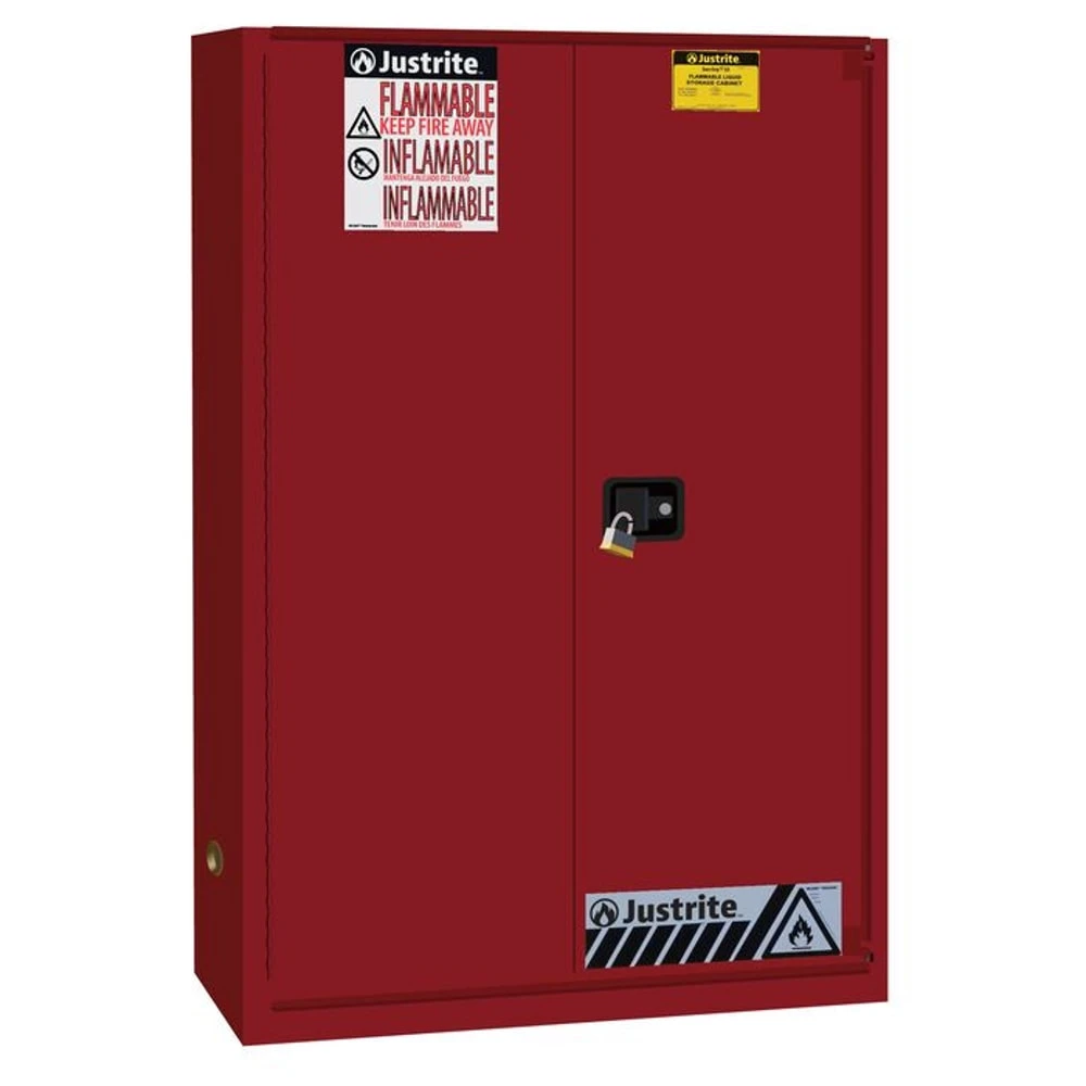 JUSTRITE 894581 Flammable Safety Cabinet, 45 Gallon, 2 Shelves, 1 Bi-Fold Self Close Door, Red