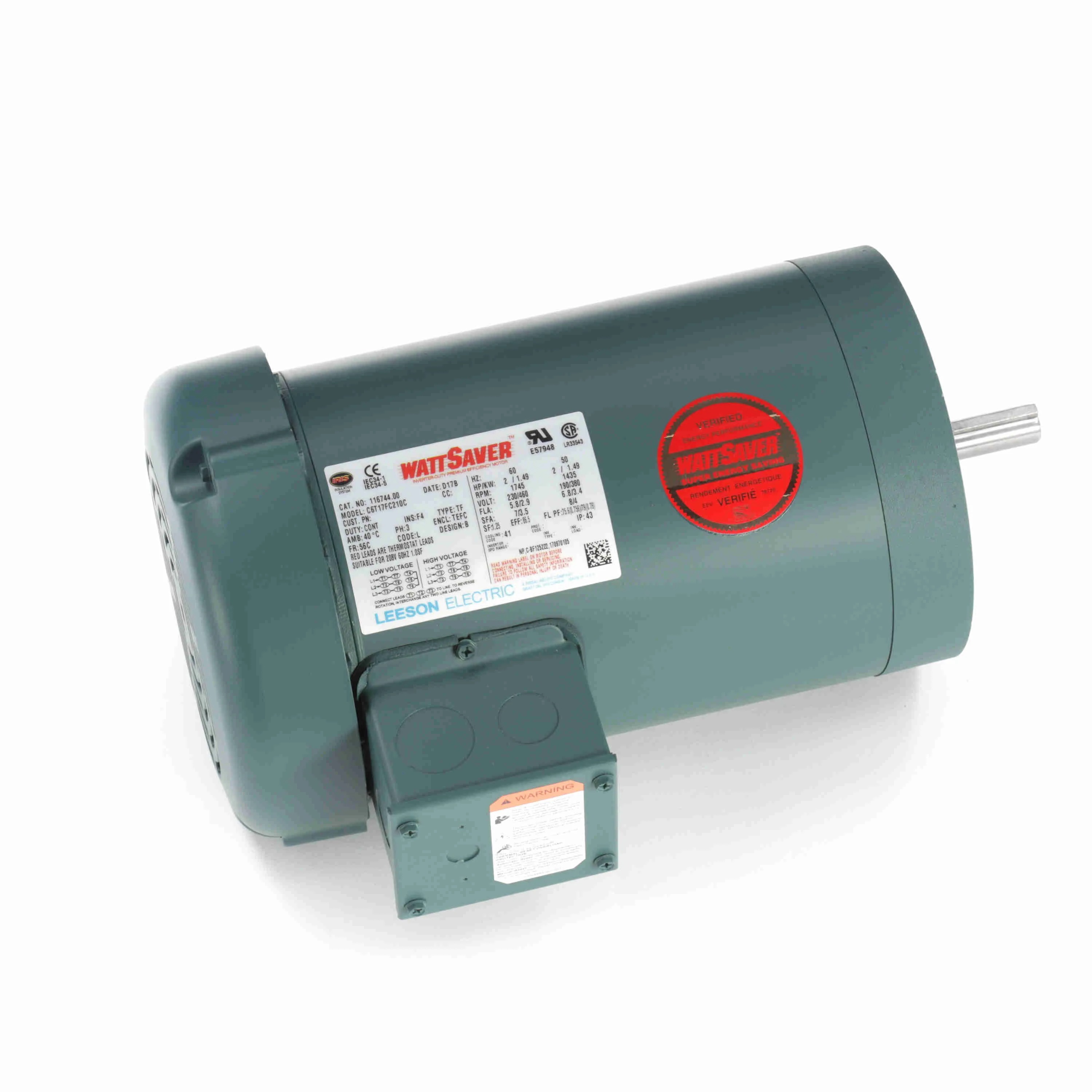 LEESON 116744.00 C6T17FC210C General Purpose Motor, 2 HP, 3 Phase, 60/50 Hz, 230/460 and 190/380V, 1800 and 1500 RPM