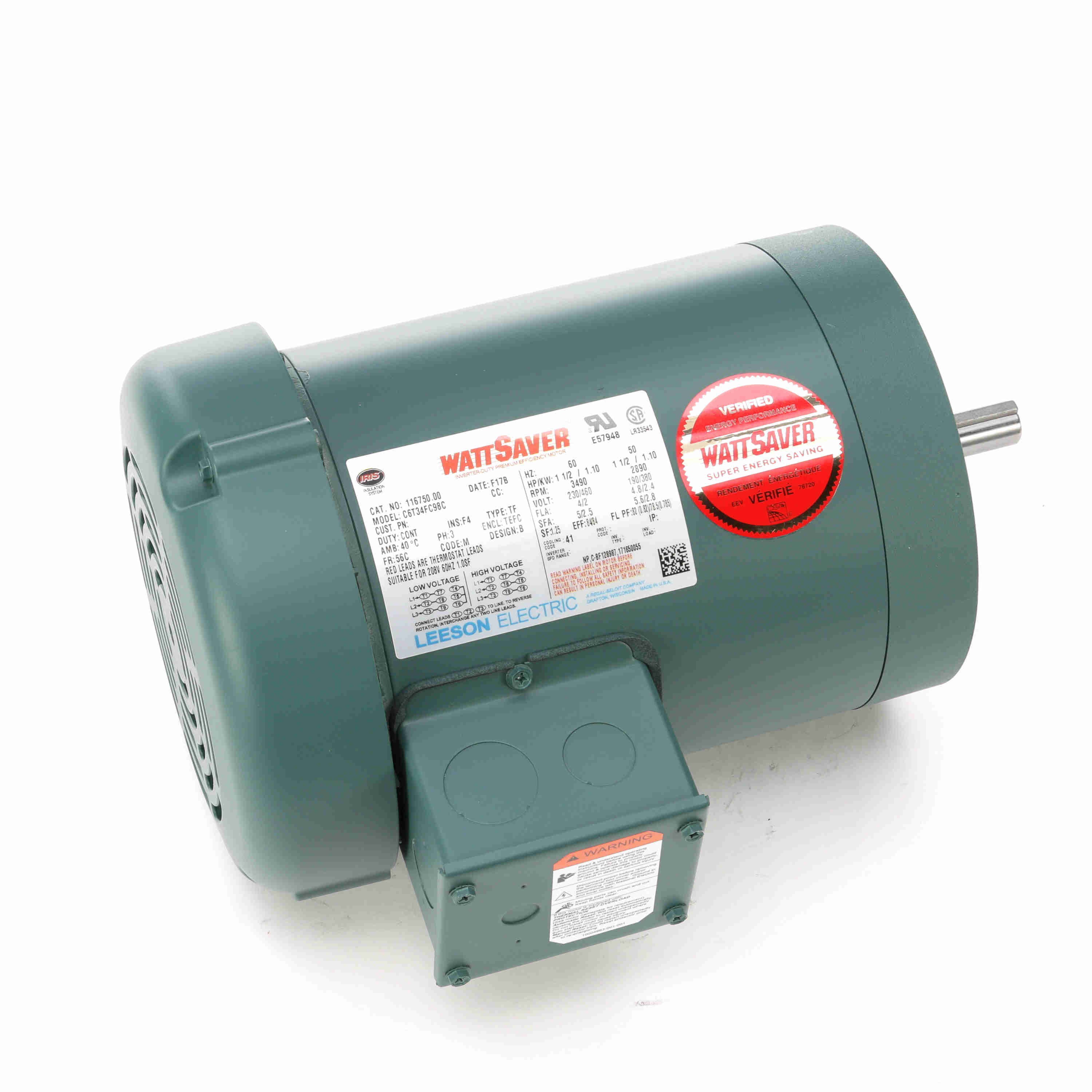 LEESON 116750.00 C6T34FC98C General Purpose Motor, 1.50 And 1.50 HP, 60 And 50 Hz, 3600 And 3000 RPM