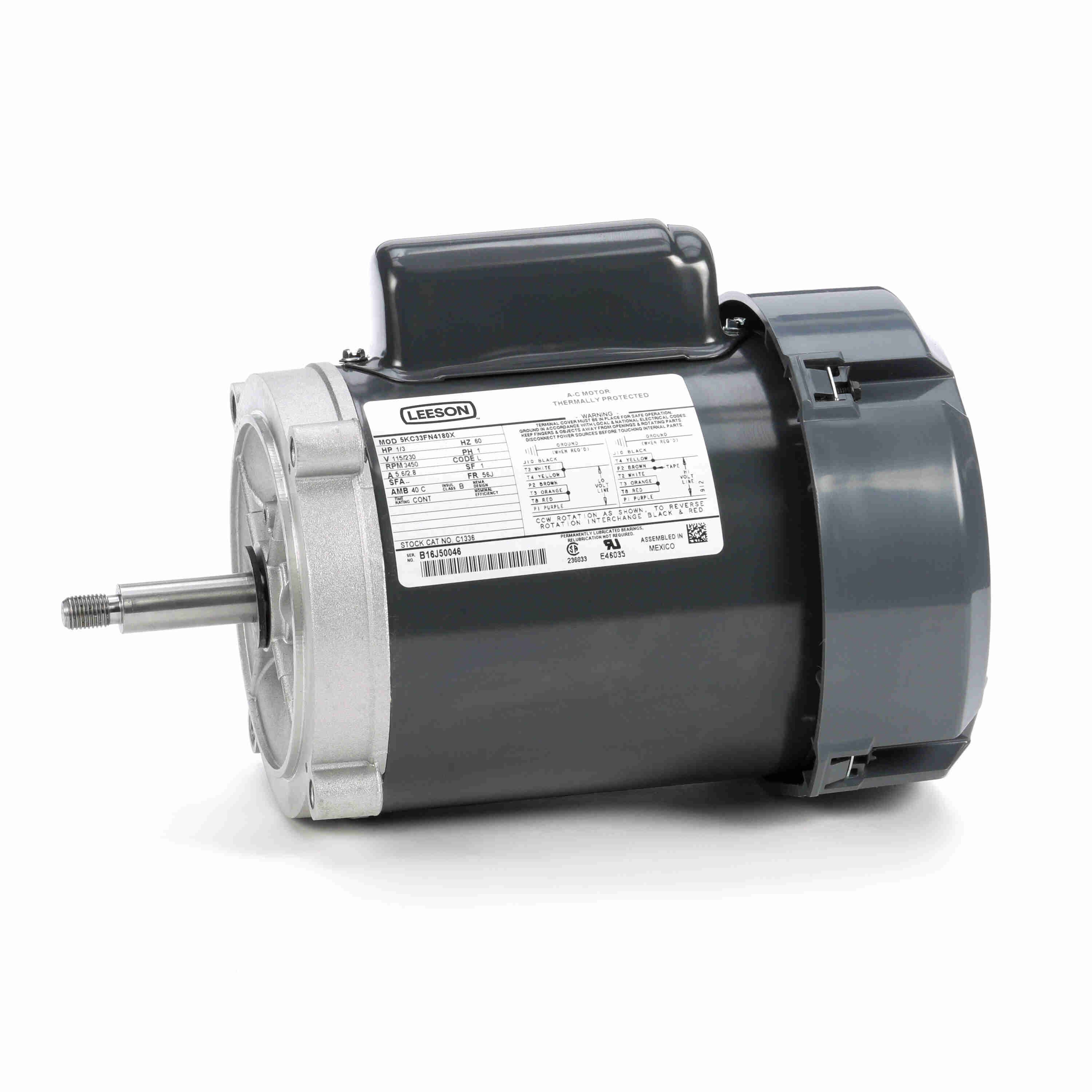 LEESON 5KC33FN4180X C1336 General Purpose Pump Motor, 0.33 HP, 1 Phase, 60 Hz, 115/230V, 3600 RPM
