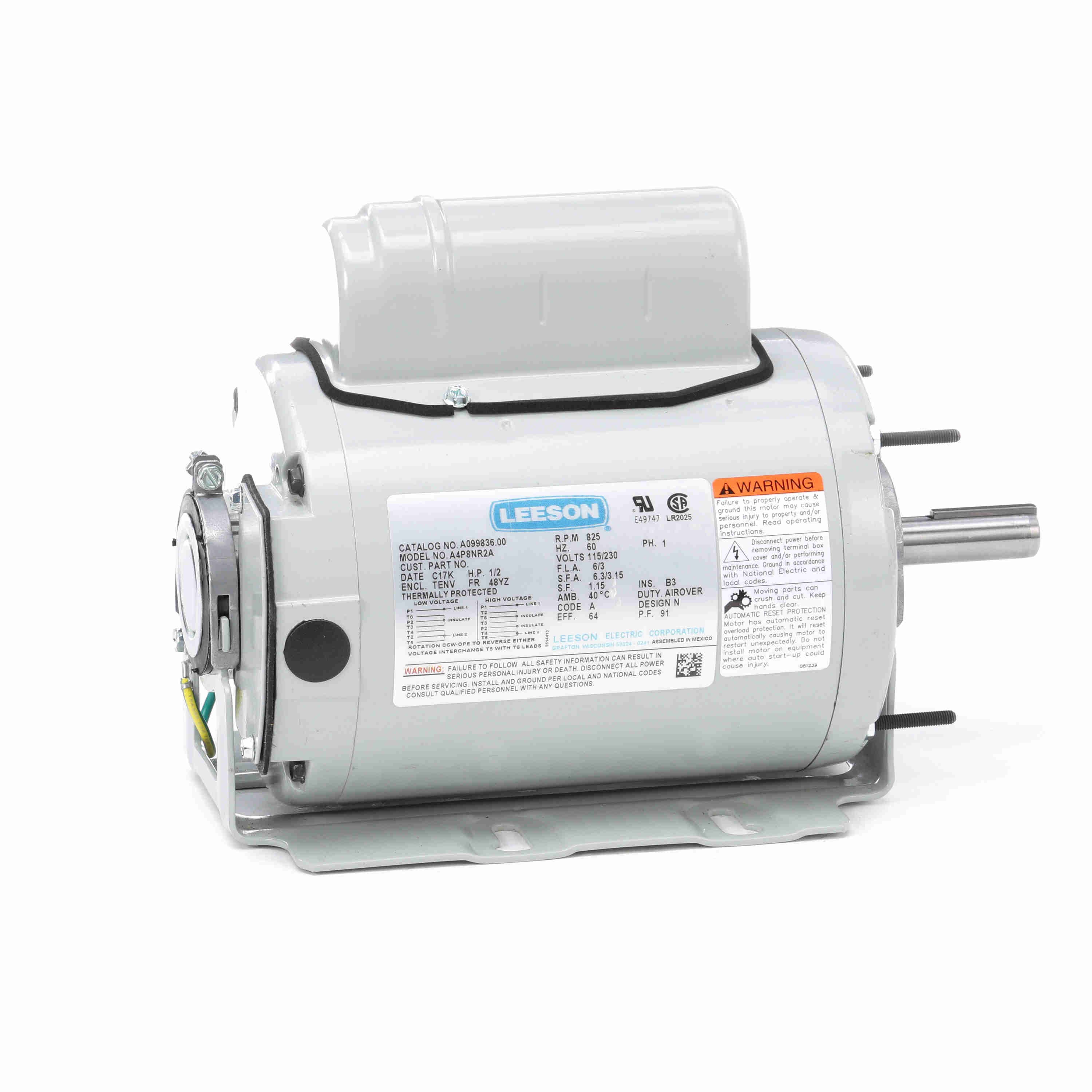 LEESON A099836.00 A4P8NR2A Agricultural Motor, 0.50 HP, 1 Phase, 60 Hz, 115/230V, 900 RPM