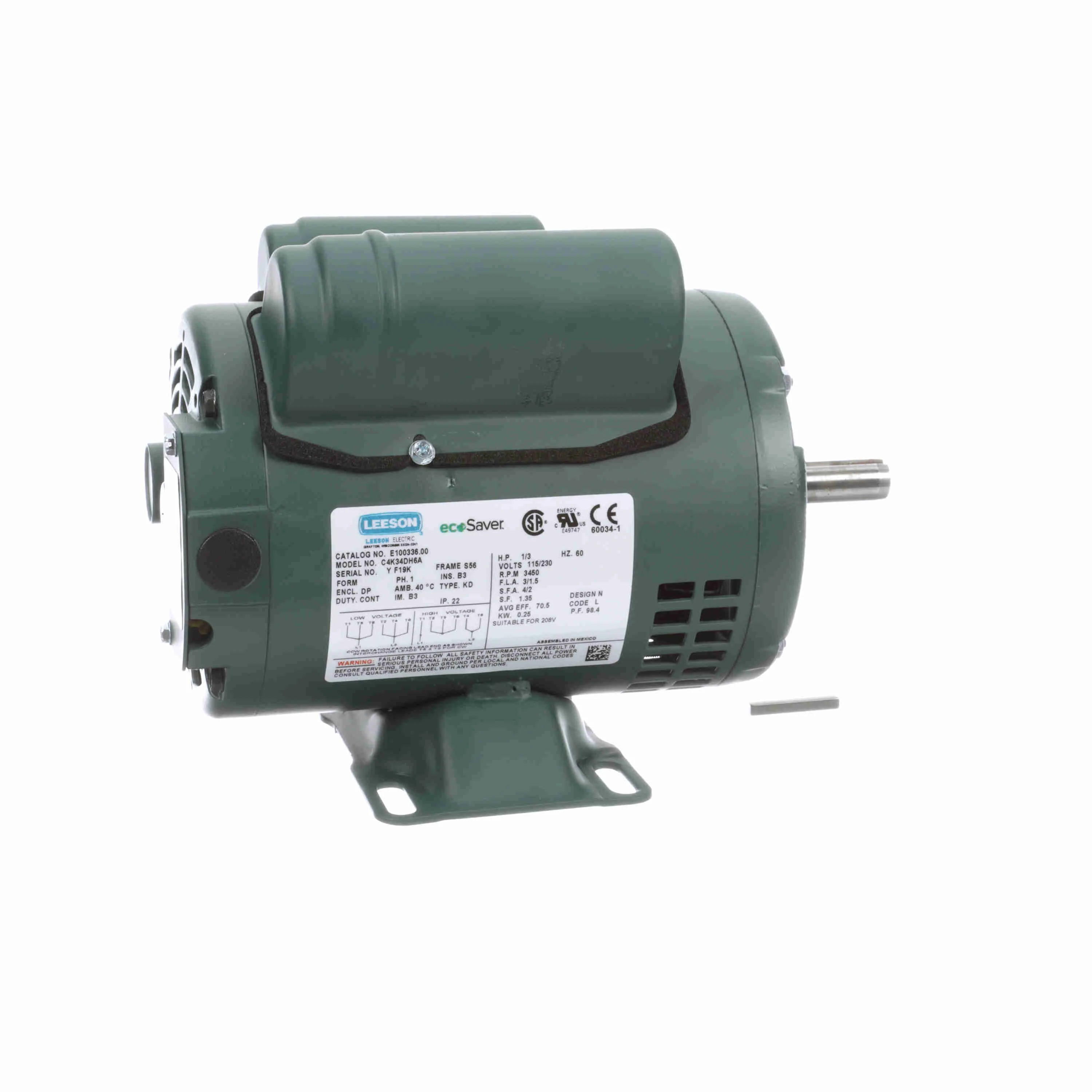 LEESON E100336.00 C4K34DH6A General Purpose Motor, 0.33 HP, 1 Phase, 60 Hz, 115/230V, 3600 RPM