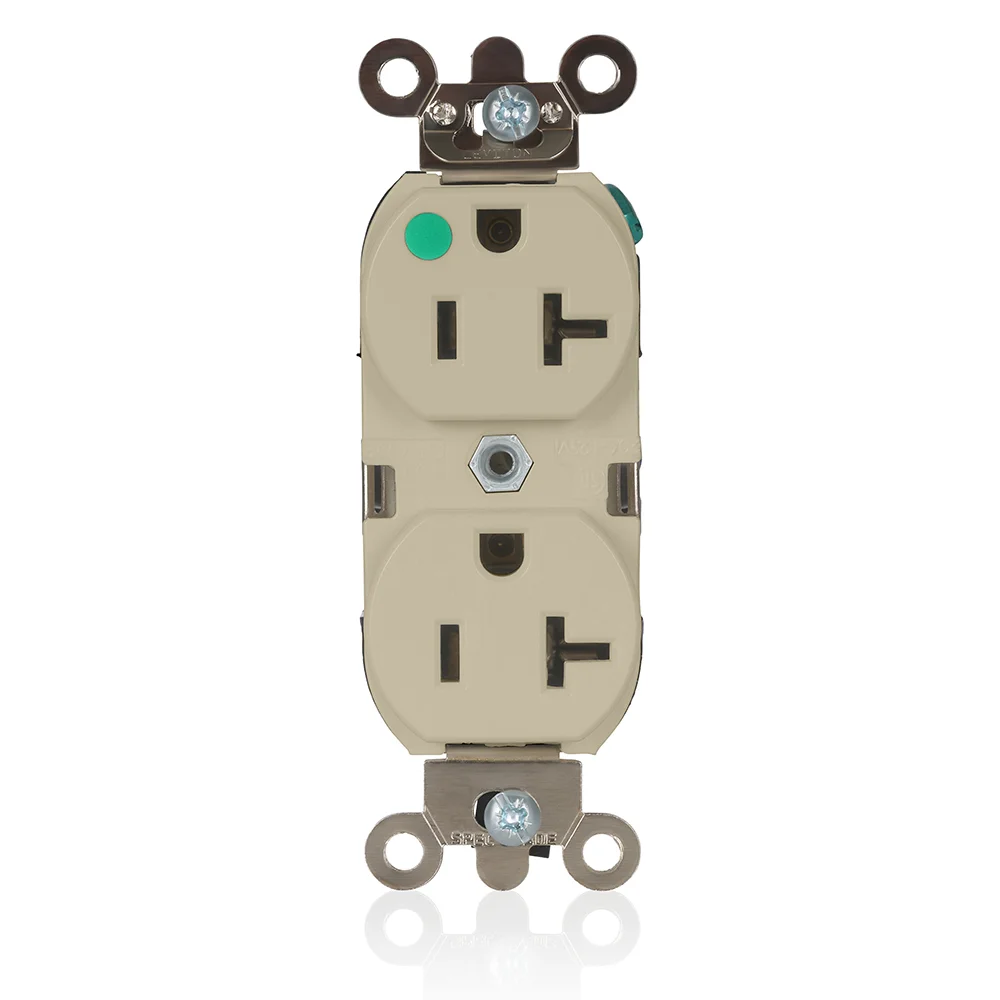 LEVITON 8300-HLI Extra Heavy Duty Illuminated Self-Grounding Straight Blade Receptacle, 1 Phase, 125 VAC, 20 A, 2 Poles, 3 Wires, Ivory