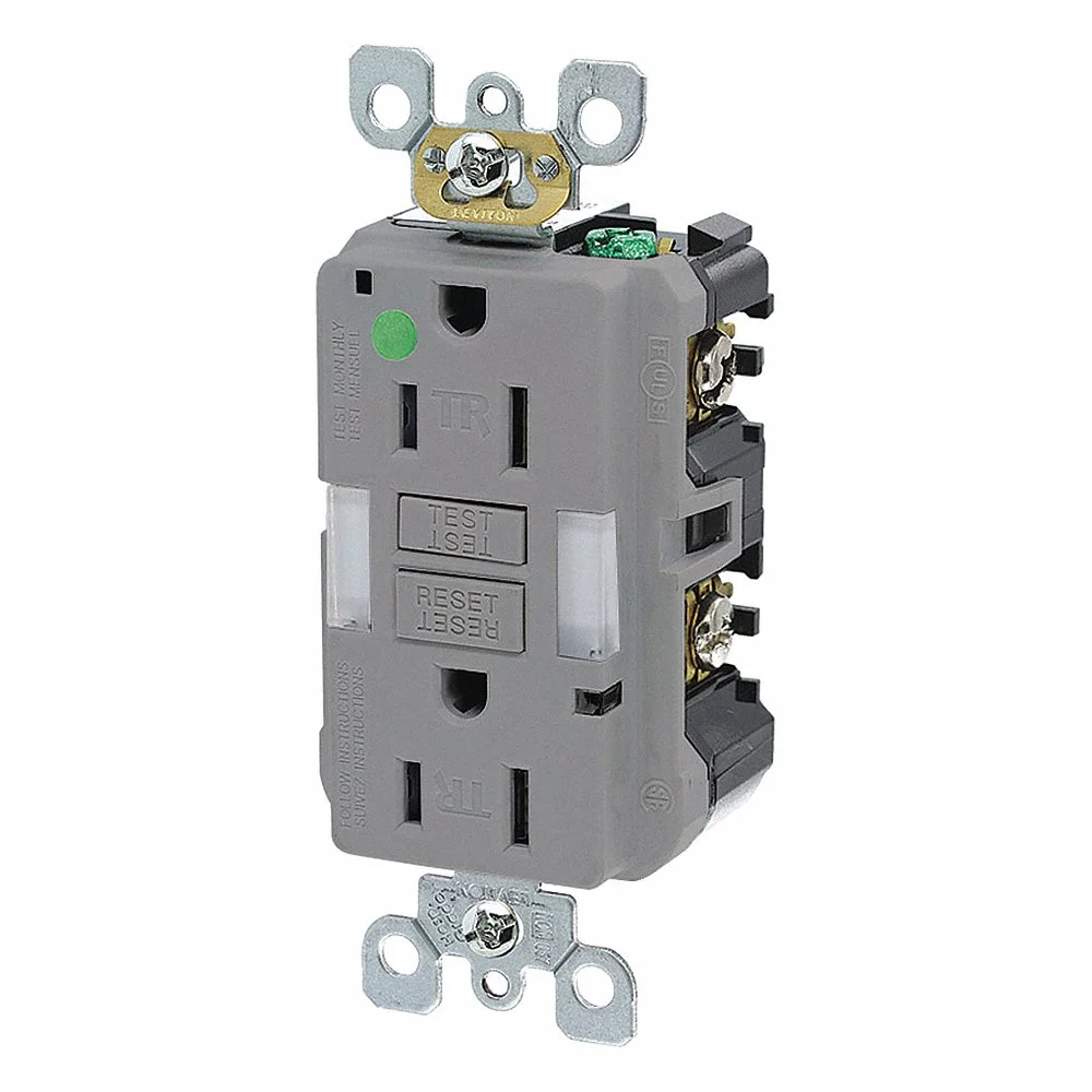 LEVITON GFNL1-HGG Duplex Feed Through Guidelight Self-Test Slim Tamper-Resistant GFCI Receptacle, 125 VAC, 15 A, 2 Poles, 3 Wires, Gray