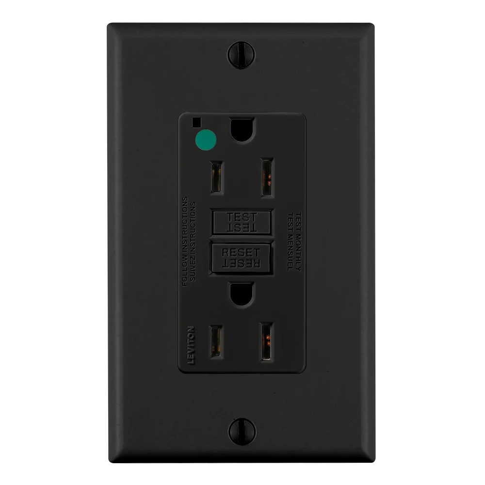 LEVITON GFNT1-HGE Feed Through Non-Tamper Resistant Self-Test GFCI Receptacle, 125 VAC, 15 A, 2 Poles, 3 Wires, Black