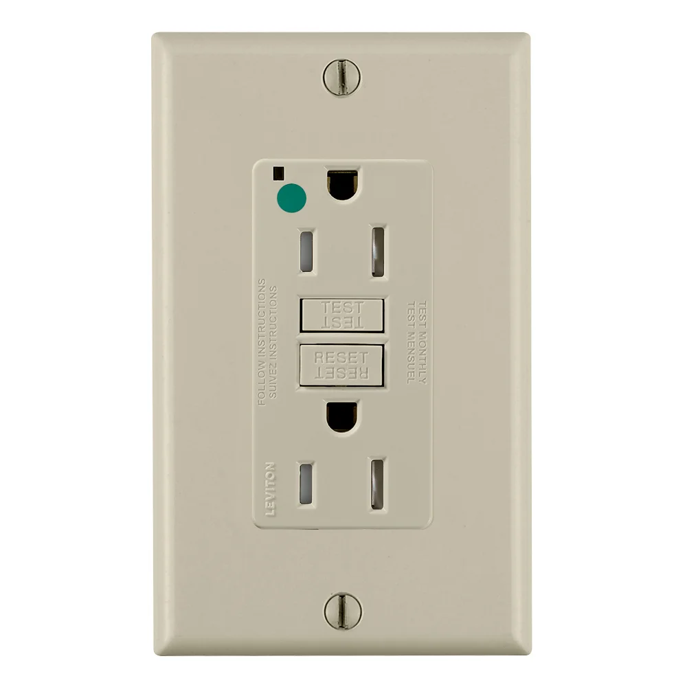 LEVITON GFTR1-HGI Self-Test Tamper Resistant GFCI Receptacle With LED Indicator, 125 VAC, 15 A, 2 Poles, 3 Wires, Ivory