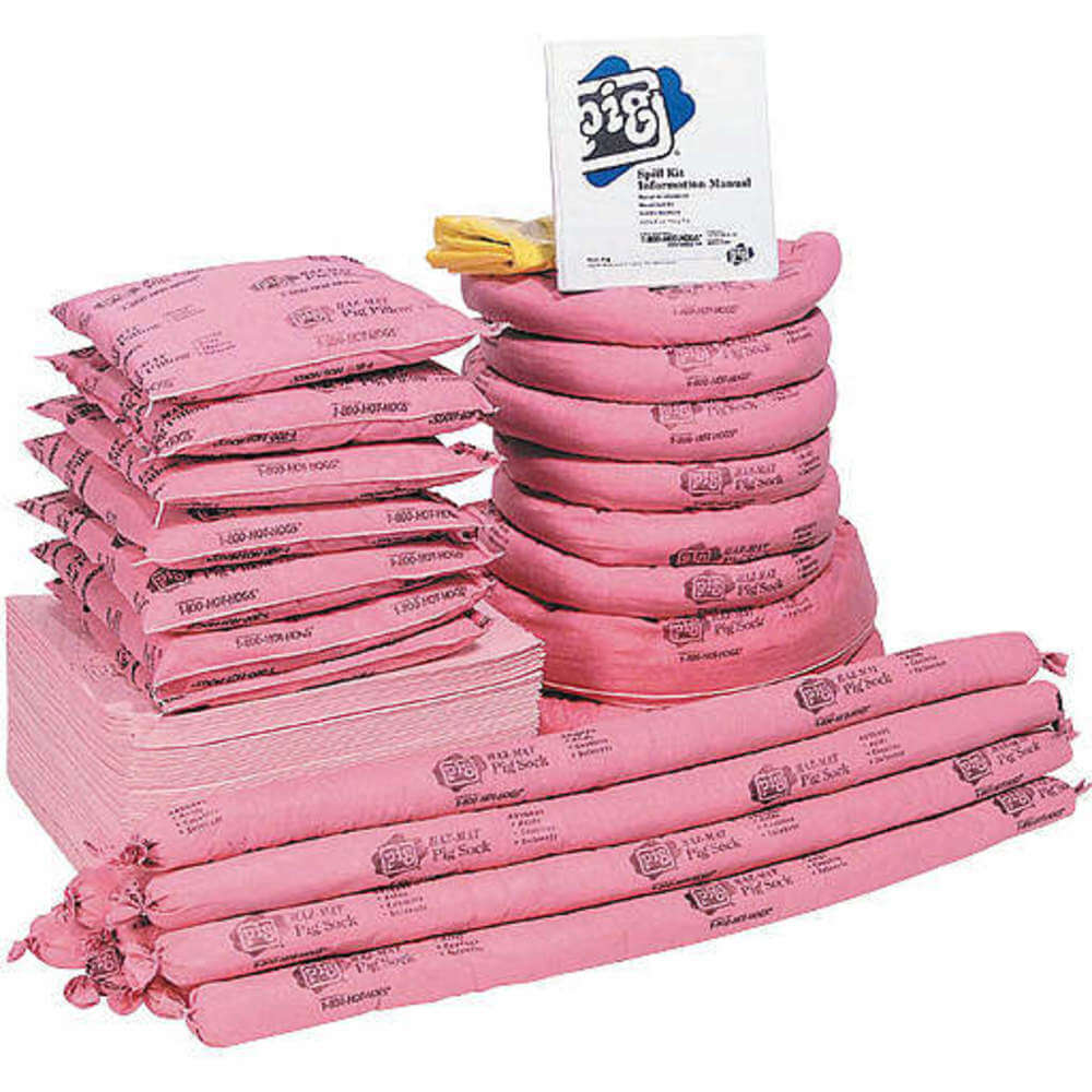 | Sorbents Included | (12) 3" D x 46" L Absorbent Chemical Sock (124Cr), (2) Ext. Dia. 5" x 10 ft. L Pig Hazmat Chemical Absorbent Dike (Ha1010), (6) 3" D x 10 ft. L Absorbent Chemical Sock (Pig301), (7) 17" W x 16" L x 2" H Harsh Chemical Absorbent Pillow (Hr7015), (75) 15" W x 20" L Absorbent Mat Pad (Mat301) |