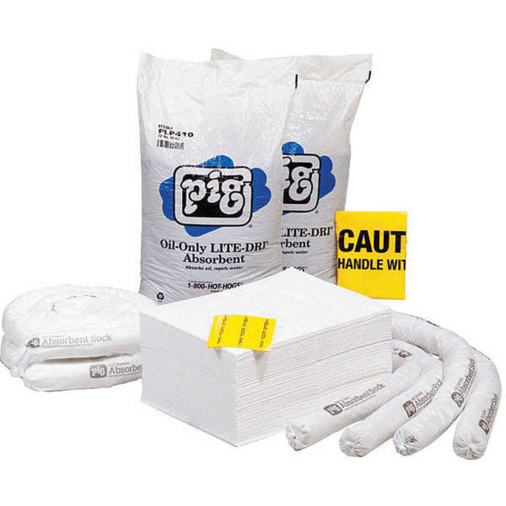| Sorbents Included | (2) Ext. Dia 3" x 10 ft. L Pig Skimmer Oil-Only Absorbent Sock (Skm203), (2) Pig Oil-Only Lite-Dry Loose Absorbent (Plp410), (4) Ext. Dia 3" x 48" L Pig Oil-Only Absorbent Sock (Skm210), (70) 15" W x 20" L Pig Stat-Mat Absorbent Pad (Mat214) |