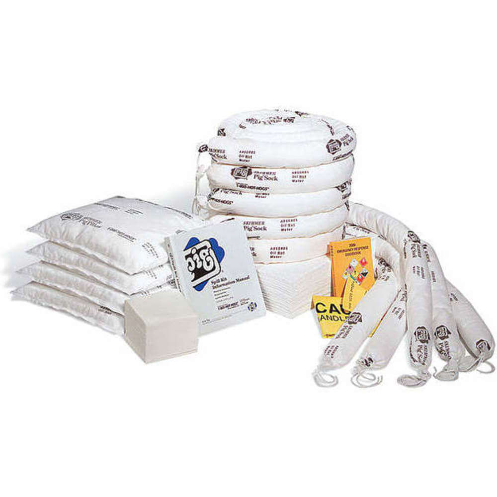 | Sorbents Included | (4) 16" W x 17" L x 1" H Pig Skimmer Oil-Only Absorbent Pillow (Pil203), (40) 15" W x 20" L Pig Stat-Mat Absorbent Pad (Mat214), (5) Ext. Dia 3" x 10 ft. L Pig Skimmer Oil-Only Absorbent Sock (Skm203), (5) Ext. Dia 3" x 48" L Pig Skimmer Oil-Only Absorbent Sock (104Ps), (56) 11.8" W x 13" L Pig Pr40 All-Purpose Wipers (Wip310) |