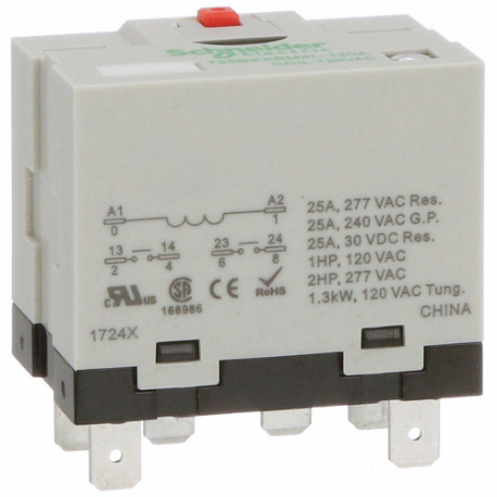 SCHNEIDER ELECTRIC 725BXXBM4L-120A Enclosed Power Relay, Socket Mounted, 25 A Current Rating, 120VAC, 6 Pins/Terminals