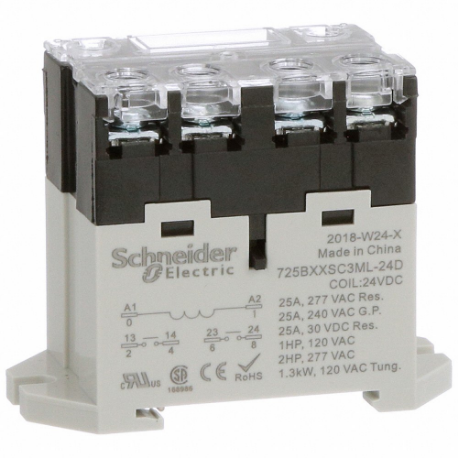 SCHNEIDER ELECTRIC 725BXXSC3ML-24D Enclosed Power Relay, Din-Rail & Surface Mounted, 25 A Current Rating, 24VDC, Dpst-No