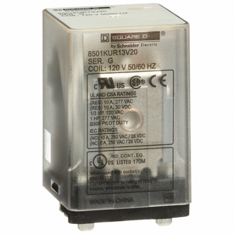 SCHNEIDER ELECTRIC 8501KUR13V20 General Purpose Relay, Socket Mounted, 10 A Current Rating, 120 VAC, 11 Pins/Terminals