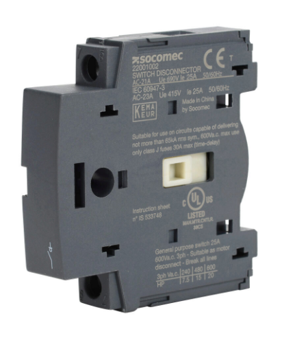 SOCOMEC 22001002 Fourth Pole Module, 600 VAC, 25A, Load Break Capable, 65Ka Sccr