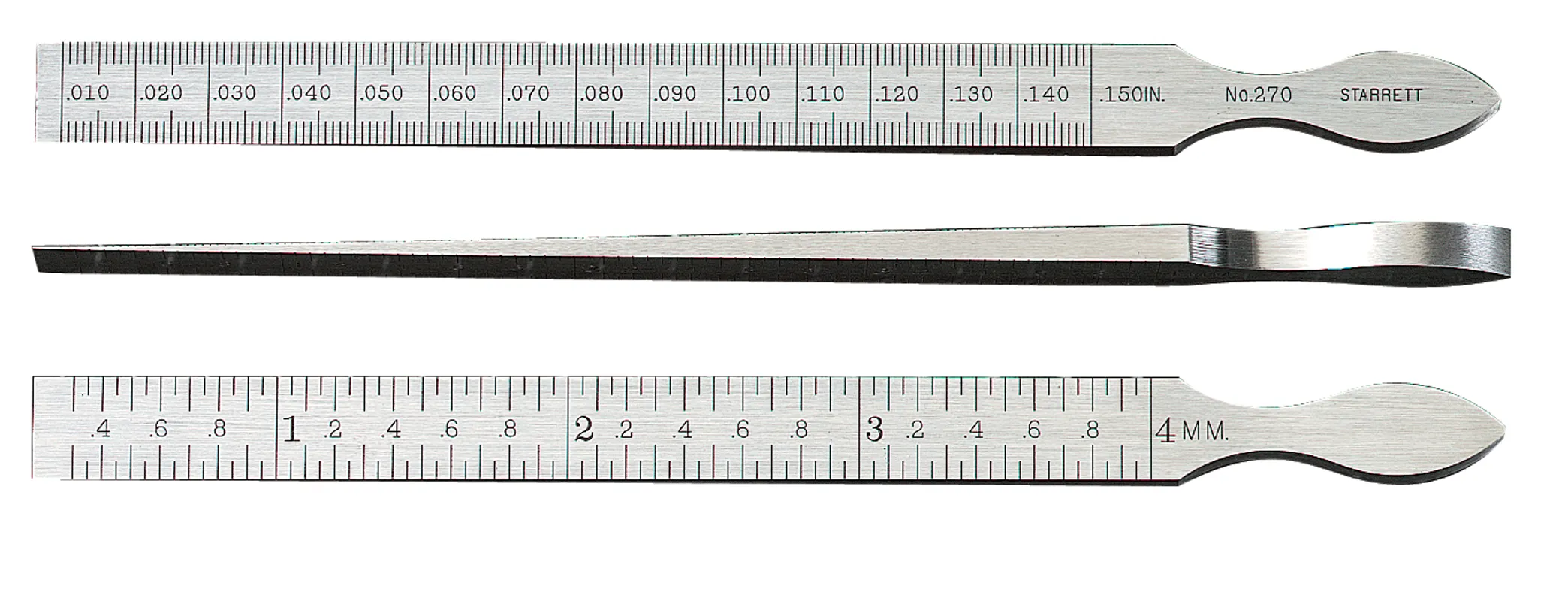 - This Starrett taper gauge is one-side graduated from 0.01 to 0.15 inch in thousandths of an inch and reverse side graduated from 0.3 mm to 4 mm in one-twentieth of a mm (0.05mm)