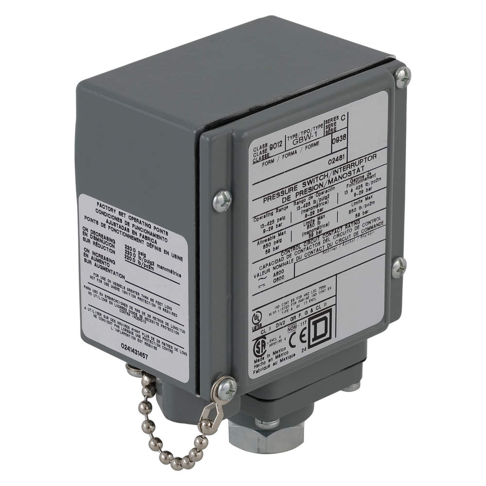 Square D 9012GBW1 pressure switch is used in pneumatic and hydraulic systems to monitor and control fluid pressure. It ensures proper system operation, safety, and equipment protection by activating or deactivating based on preset pressure levels. This pressure switch features screw clamp terminals for electrical connection and 0.25 inch 18 NPTF inlet for easy fluid connection. It comes with a diaphragm actuator, adjustable differential scale and dual threshold regulation. This pressure switch comes with 5 million operating cycles and has a die-cast aluminium alloy 380 enclosure for increased protection and corrosion resistance.