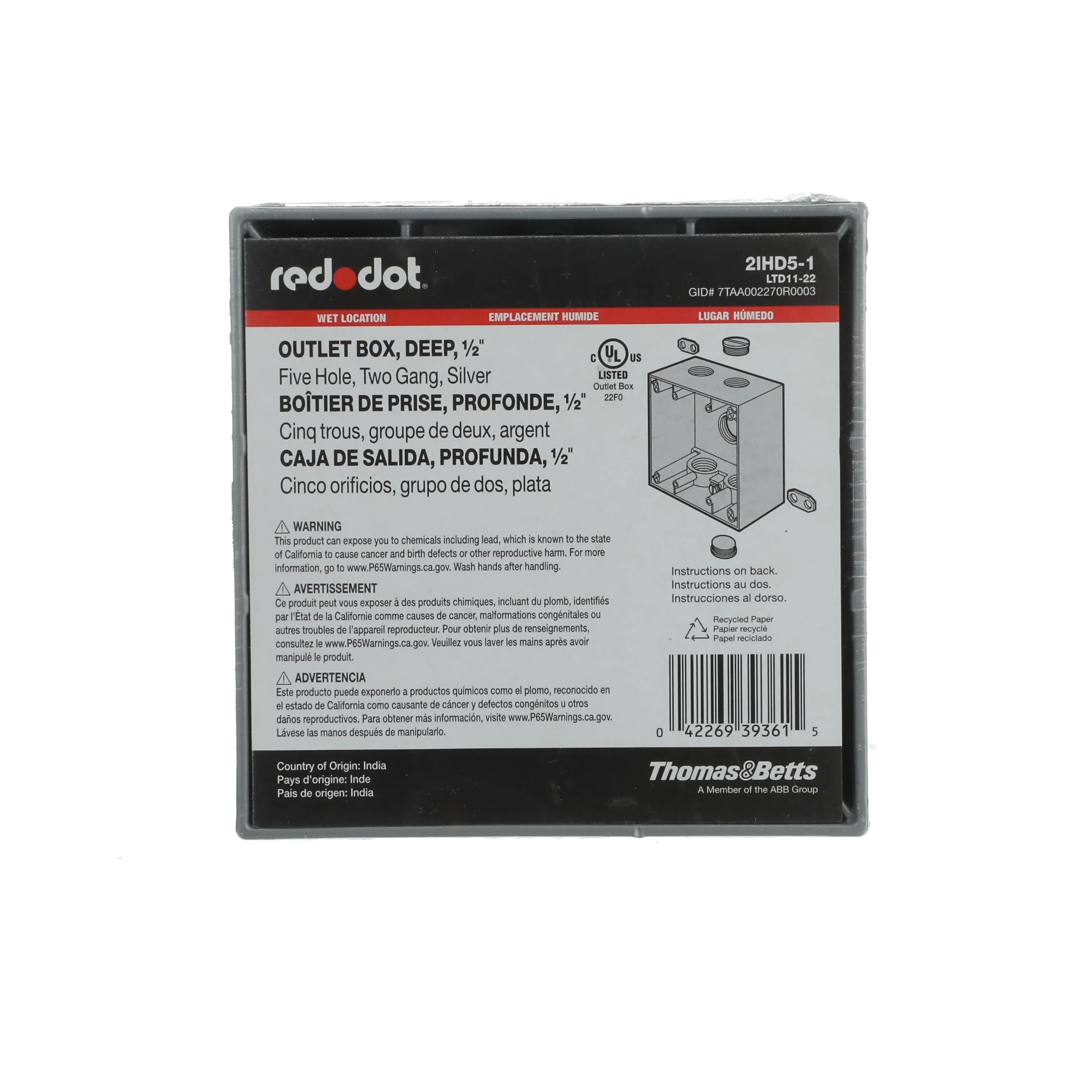 THOMAS & BETTS 2IHD5-1 Red Dot Two Gang Deep Universal Weatherproof Box, 42 Cubic Inch