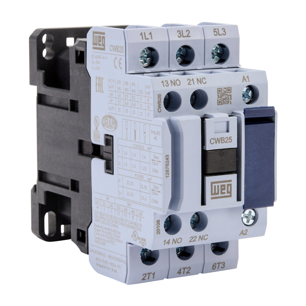 WEG CWB25-11-30D39 12876243 Contactor, 25 A Rated, 3 NO Main Contact, 1 NO, 1 NC Aux Contact, 480V 50/60Hz