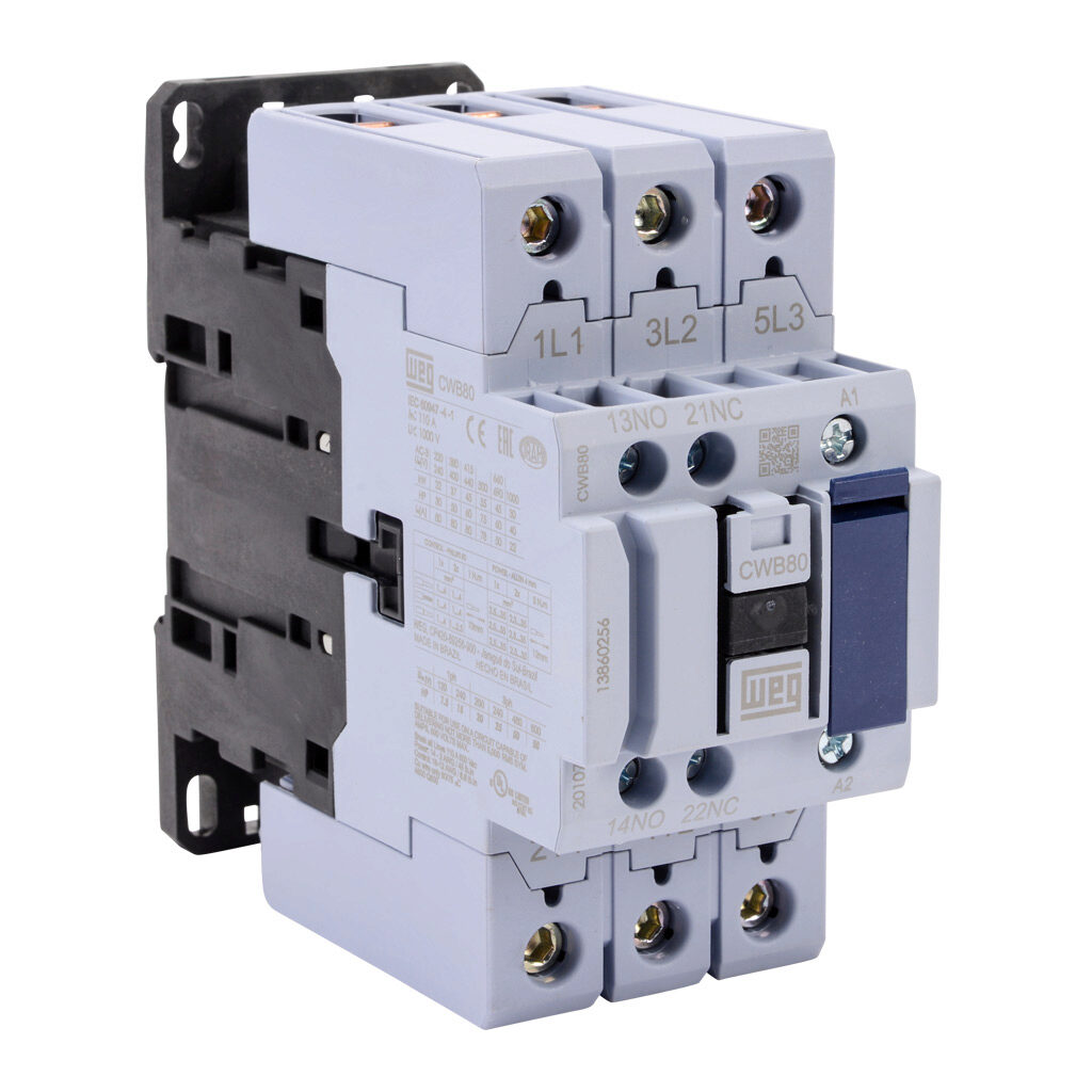 WEG CWB80-11-30V24 13860256 Contactor, 80 A Rated, 3 NO Main Contact, 1 NO, 1 NC Aux Contact, 180-208V 50Hz/208-240V 60Hz