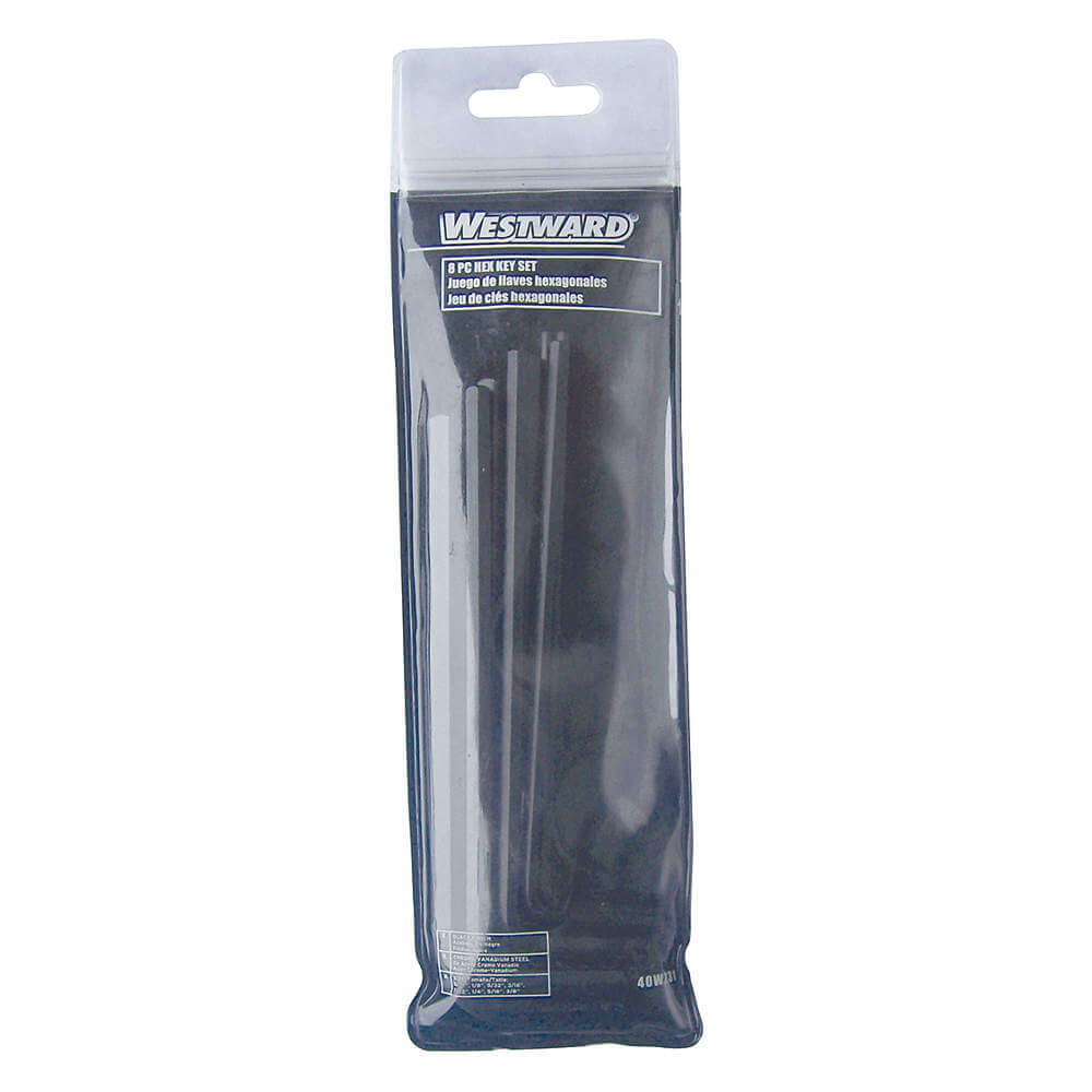 WESTWARD 40WZ31 Hex Key Set, L, SAE, Std End, Long, Black Oxide, 2 Tips, 8 Pieces