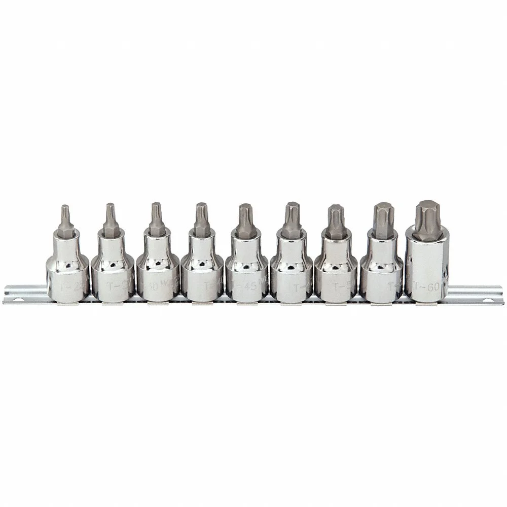 WESTWARD 54TN47 Socket Bit Set, 1/2 Inch Drive Size, 9 Pieces, T25 To T60 Tip Sizes, Torx