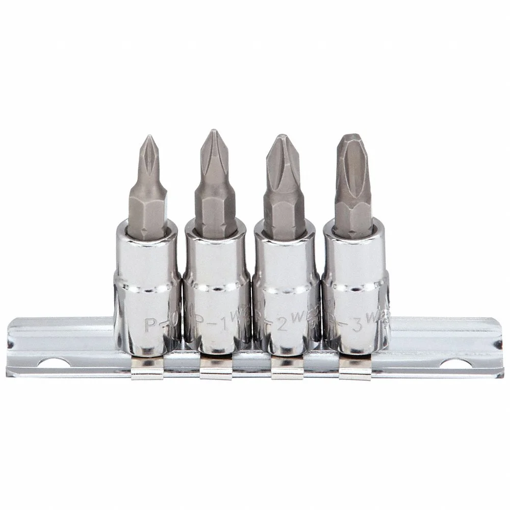 WESTWARD 54TN79 Socket Bit Set, 1/4 Inch Drive Size, 6 Pieces, PH0 To PH3 Tip Sizes