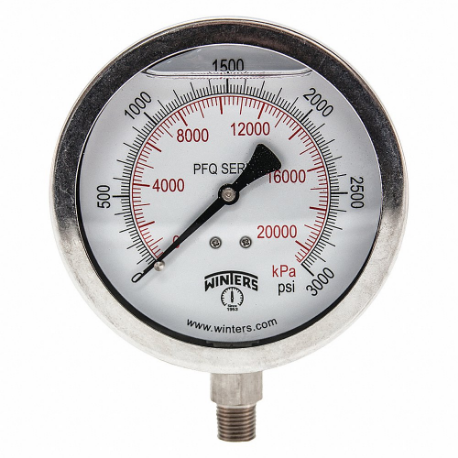 WINTERS INSTRUMENTS PFQ1531-DRY Industrial Pressure Gauge, Field-Fillable, 0 To 3000 Psi, 4 Inch Dial