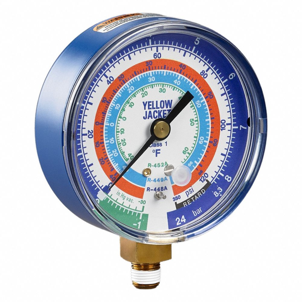 YELLOW JACKET 49028 Low Side Gauge, Non-Liquid Filled, 2 1/2 Inch Dia, 1/8 Inch Male NPT, Blue